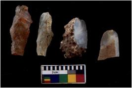| Description / विवरण | Specimen of flakes tool with prominent flaking marks. It made up of a short flakes with sides trimmed. |