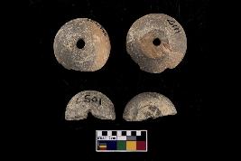 | Description / विवरण | Areca nut bead, flat base with perforation at center. |