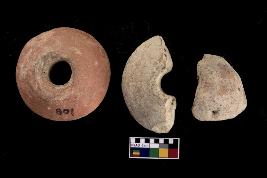 | Description / विवरण | One intact, one broken, areca nut shaped, flat base, centrally perforated. |