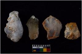| Description / विवरण | There are n 4 flakes tool; there are multidirectional irregular scar pattern on them; made of short flakes and all four have tapering edges. |