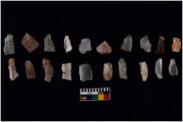 | Description / विवरण | Specimen of flakes tool with prominent flaking marks. It made up of a short flakes with sides trimmed. |