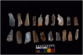 | Description / विवरण | Specimen of flakes tool with prominent flaking marks. It made up of a short flakes with sides trimmed. |