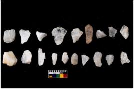 | Description / विवरण | Specimen of flakes tool with prominent flaking marks. It made up of a short flakes with sides trimmed. |