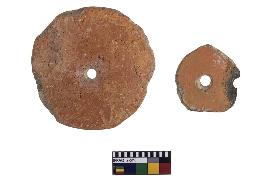 | Description / विवरण | Circular in shape, centraly perforted, well fired, 2 nos. |
