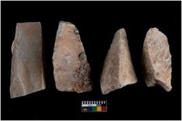 | Description / विवरण | There are n 4 utilized flakes. There are multi directional irregular scar pattern on both dorsal and ventral face of the flakes. three are tapering at one end and one has blunted edge. |