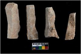 | Description / विवरण | There are n 4 utilized flakes. There are multi directional irregular scar pattern on both dorsal and ventral face of the flakes. three are sharp at one end and one has blunted edge. |