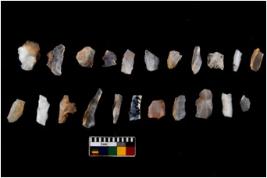 | Description / विवरण | Specimen of flakes tool with prominent flaking marks. It made up of a short flakes with sides trimmed. |