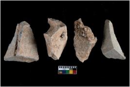 | Description / विवरण | There are n 4 utilized flakes. There are multi directional irregular scar pattern on both dorsal and ventral face of the flakes. three are tapering at one end and one has sharp edge. |