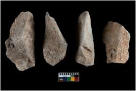 | Description / विवरण | There are n 4 utilized flakes. There are multi directional irregular scar pattern on both dorsal and ventral face of the flakes. three are tapering at one end and one has sharp edge. |