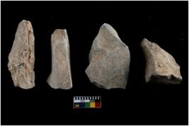 | Description / विवरण | There are n 4 utilized flakes. There are multi directional irregular scar pattern on both dorsal and ventral face of the flakes. Two are tapering at one end and two have blunted edges. |