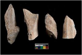 | Description / विवरण | There are n 4 utilized flakes. There are multi directional irregular scar pattern on both dorsal and ventral face of the flakes. three are tapering at one end and one has blunted edge. |