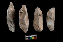 | Description / विवरण | There are n 4 utilized flakes. There are multi directional irregular scar pattern on both dorsal and ventral face of the flakes. two are pointed at one end and two have tapered edges. |