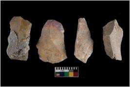 | Description / विवरण | There are n 4 utilized flakes. There are multi directional irregular scar pattern on both dorsal and ventral face of the flakes. Two are tapering at one end and one has sharp edge, and one has pointed edge. |