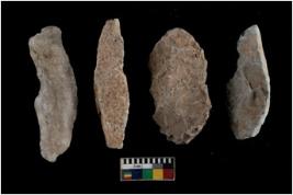 | Description / विवरण | There are n 4 utilized flakes. There are multi directional irregular scar pattern on both dorsal and ventral face of the flakes. three are tapering at one end and one has blunted edge. |