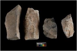 | Description / विवरण | There are n 4 utilized flakes. There are multi directional irregular scar pattern on both dorsal and ventral face of the flakes. one has tapering at one end and one has blunted, two are sharp edges. |
