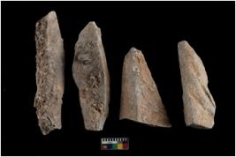 | Description / विवरण | There are n 4 utilized flakes. There are multi directional irregular scar pattern on both dorsal and ventral face of the flakes. three are tapering at one end and one has sharp edge. |