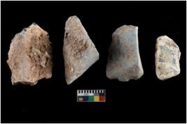 | Description / विवरण | There are n 4 utilized flakes. There are multi directional irregular scar pattern on both dorsal and ventral face of the flakes. three are tapering at one end and one has blunted edge. |