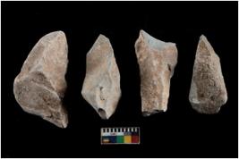 | Description / विवरण | There are n 4 utilized flakes. There are multi directional irregular scar pattern on both dorsal and ventral face of the flakes. three are sharp at one end and one has ponted edge. |