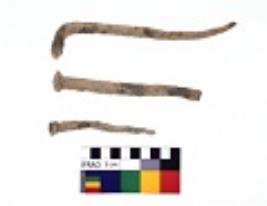| Description / विवरण | Circular in section, one is slightly curved from the top with tapering end, other 2 have circular cap on to with tapering end, rusted surface |