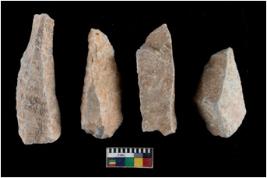 | Description / विवरण | There are n 4 utilized flakes. There are multi directional irregular scar pattern on both dorsal and ventral face of the flakes. three are tapering at one end and one has blunted edge. |
