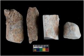 | Description / विवरण | There are n 4 utilized flakes. There are multi directional irregular scar pattern on both dorsal and ventral face of the flakes. Two are tapering at one end and two have sharp edges. |