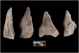 | Description / विवरण | There are n 4 utilized flakes. There are multi directional irregular scar pattern on both dorsal and ventral face of the flakes. Two are pen pointed at one end and two have sharp edges. |