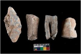 | Description / विवरण | There are n 4 utilized flakes. There are multi directional irregular scar pattern on both dorsal and ventral face of the flakes. three are tapering at one end and one has sharp edges. |