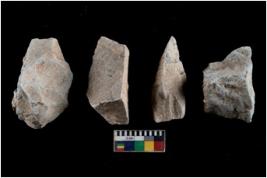 | Description / विवरण | There are n 4 utilized flakes. There are multi directional irregular scar pattern on both dorsal and ventral face of the flakes. Two are tapering at one end and one has blunted edge, and one has pen pointed edge. |