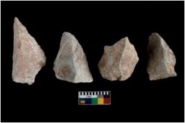 | Description / विवरण | There are n 4 utilized flakes. There are multi directional irregular scar pattern on both dorsal and ventral face of the flakes. three are tapering at one end and one has pointed edge. |