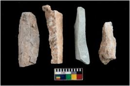 | Description / विवरण | There are n 4 utilized flakes. There are multi directional irregular scar pattern on both dorsal and ventral face of the flakes. Two are tapering at one end and two have sharp edges. |