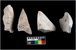 | Description / विवरण | There are n 4 utilized flakes. There are multi directional irregular scar pattern on both dorsal and ventral face of the flakes. Two are tapering at one end and two have sharp edges. |