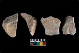| Description / विवरण | There are n 4 utilized flakes. There are multi directional irregular scar pattern on both dorsal and ventral face of the flakes. three are tapering at one end and one has sharp edge. |