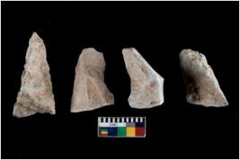 | Description / विवरण | There are n 4 utilized flakes. There are multi directional irregular scar pattern on both dorsal and ventral face of the flakes. three are sharp at one end and one has pointed edge. |
