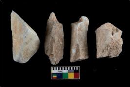 | Description / विवरण | There are n 4 utilized flakes. There are multi directional irregular scar pattern on both dorsal and ventral face of the flakes. three are tapering at one end and one has sharp edge. |