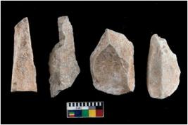 | Description / विवरण | There are n 4 utilized flakes. There are multi directional irregular scar pattern on both dorsal and ventral face of the flakes. three are tapering at one end and one has blunted edge. |