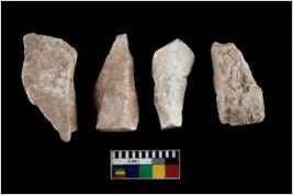 | Description / विवरण | There are n 4 utilized flakes. There are multi directional irregular scar pattern on both dorsal and ventral face of the flakes. three are tapering at one end and one has sharp edge. |