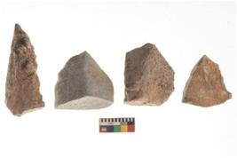 | Description / विवरण | There are n 4 utilized flakes. There are multi directional irregular scar pattern on both dorsal and ventral face of the flakes. One has pen pointed at one end, and one has flat base, and two have sharp edges. |