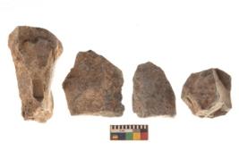 | Description / विवरण | There are n 4 utilized flakes. There are multi directional irregular scar pattern on both dorsal and ventral face of the flakes. Three are tapering at one end and one has blunted edge. |