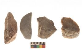 | Description / विवरण | There are n 4 utilized flakes. There are multi directional irregular scar pattern on both dorsal and ventral face of the flakes. Three are tapering at one end and one has blunted edge. |