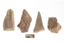 | Description / विवरण | There are n 4 utilized flakes. There are multi directional irregular scar pattern on both dorsal and ventral face of the flakes. Three are tapering at one end and one has blunted edge. |
