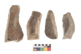 | Description / विवरण | There are n 4 utilized flakes. There are multi directional irregular scar pattern on both dorsal and ventral face of the flakes. three are tapering at one end and one has blunted edge. |