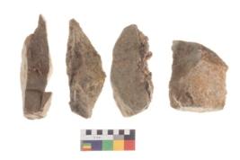 | Description / विवरण | There are n 4 utilized flakes. There are multi directional irregular scar pattern on both dorsal and ventral face of the flakes. Two are ponited at one end and one has blunted edge, and one has sharp edge. |