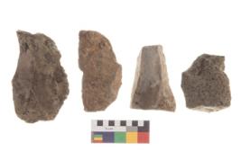 | Description / विवरण | There are n 4 utilized flakes. There are multi directional irregular scar pattern on both dorsal and ventral face of the flakes. Two are sharp at one end and two have flat base edges. |
