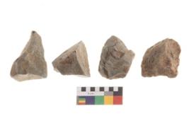 | Description / विवरण | There are n 4 utilized flakes. There are multi directional irregular scar pattern on both dorsal and ventral face of the flakes. three are tapering at one end and one has pointed edge. |
