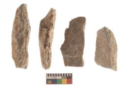 | Description / विवरण | There are n 4 utilized flakes. There are multi directional irregular scar pattern on both dorsal and ventral face of the flakes. Two are tapering at one end and two have blunted edges. |
