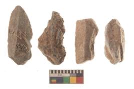 | Description / विवरण | There are n 4 utilized flakes. There are multi directional irregular scar pattern on both dorsal and ventral face of the flakes. Two are tapering at one end and one has blunted edge, and one has sharp edge. |