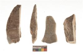 | Description / विवरण | There are n 4 utilized flakes. There are multi directional irregular scar pattern on both dorsal and ventral face of the flakes. three are tapering at one end and one has blunted edge. |