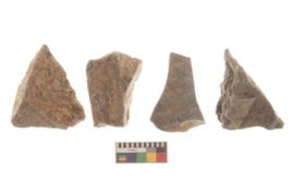 | Description / विवरण | There are n 4 utilized flakes. There are multi directional irregular scar pattern on both dorsal and ventral face of the flakes. three are tapering at one end and one has sharp edge. |