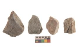 | Description / विवरण | There are n 4 utilized flakes. There are multi directional irregular scar pattern on both dorsal and ventral face of the flakes. three are tapering at one end and one has blunted edge. |