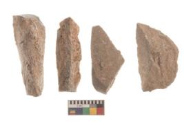 | Description / विवरण | There are n 4 utilized flakes. There are multi directional irregular scar pattern on both dorsal and ventral face of the flakes. Two are tapering at one end and two have blunted edges. |